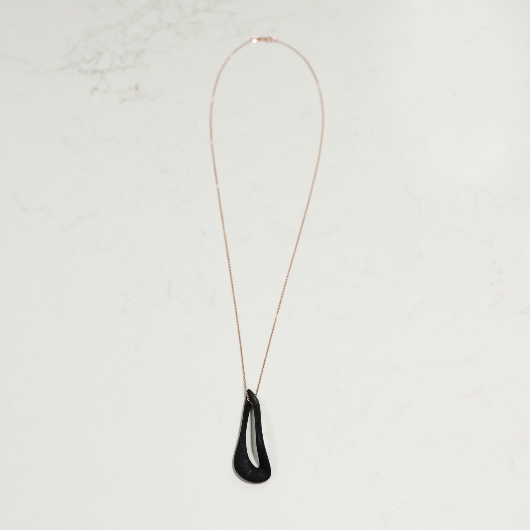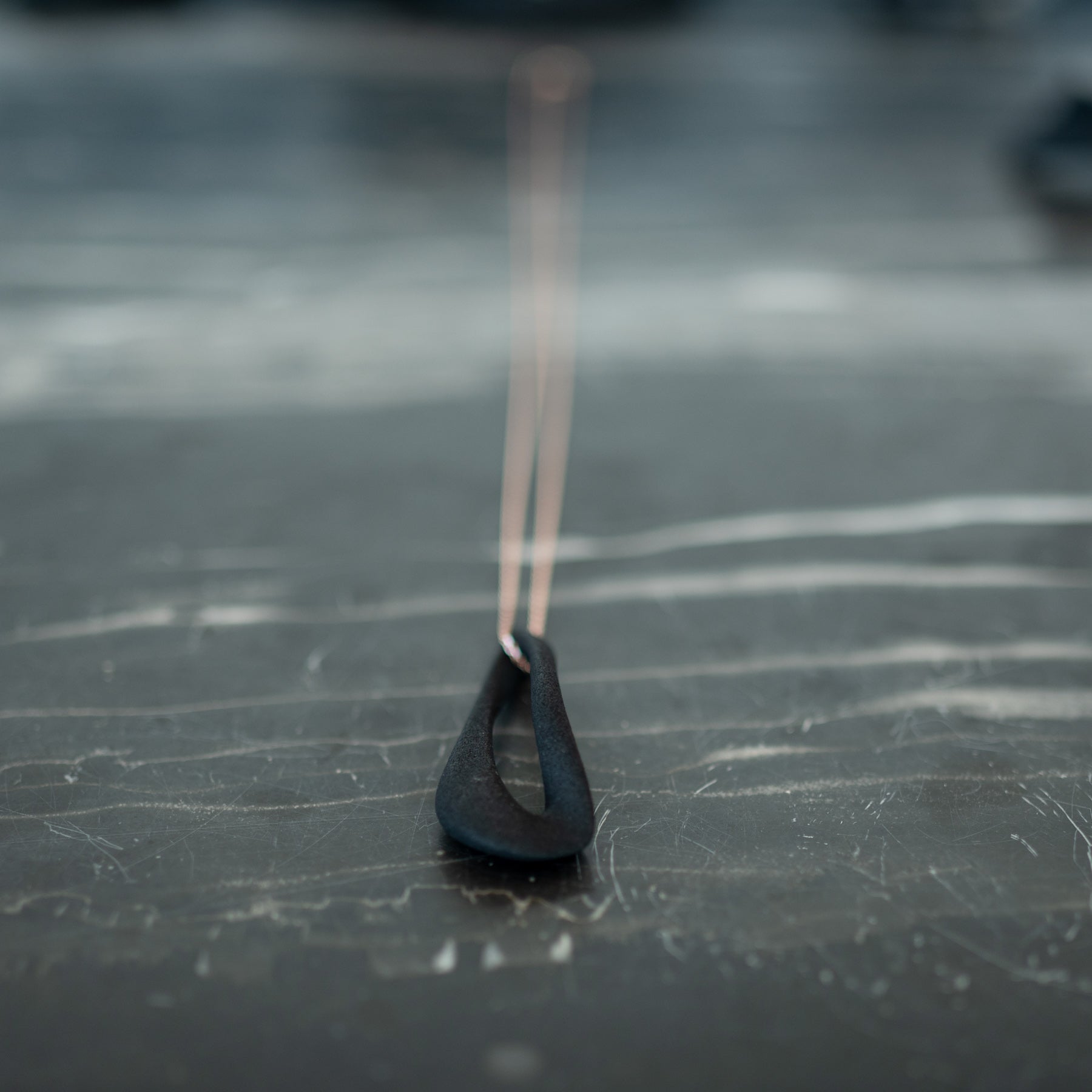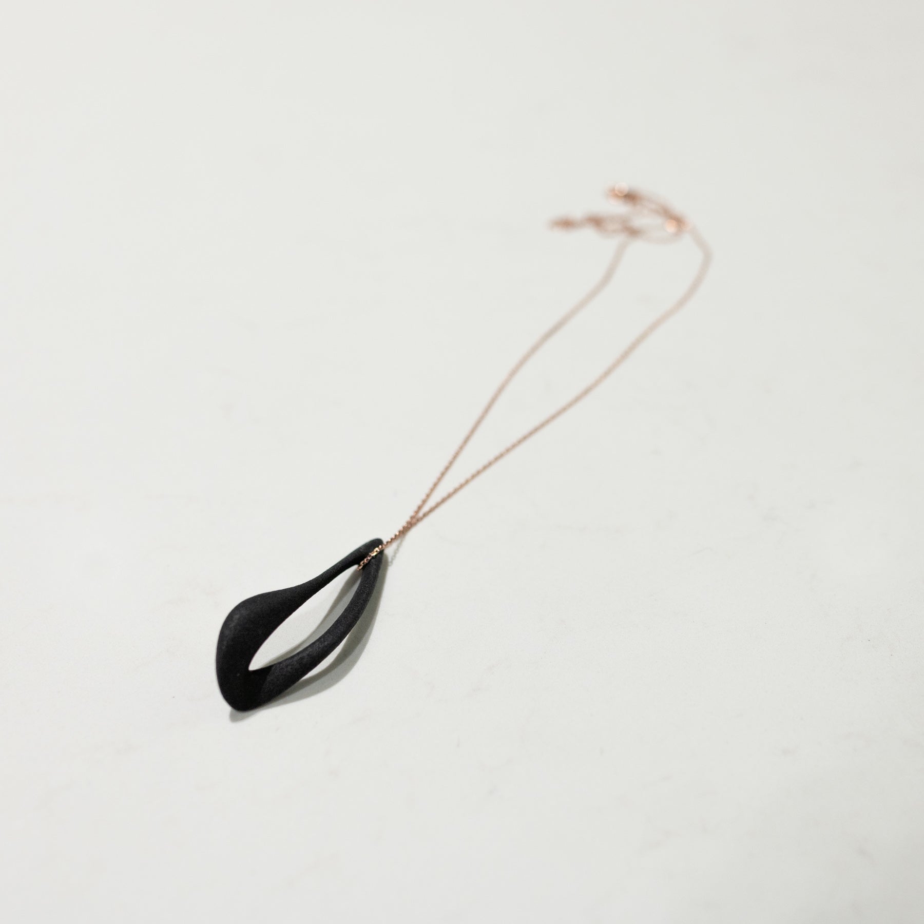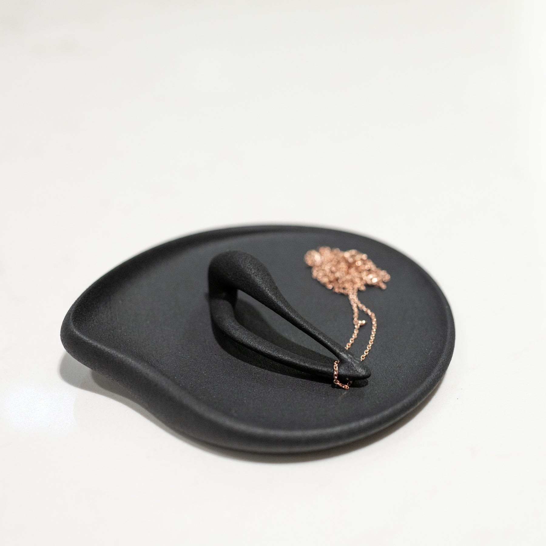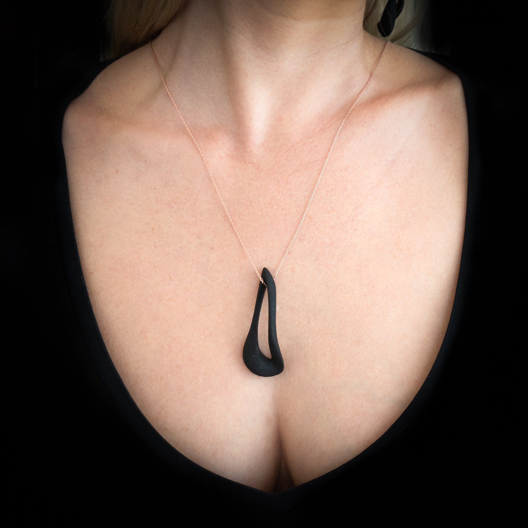 The Eloura Necklace is produced through SLS 3D printing in nylon PA12, an innovative and sustainable material known for precision, strength, and lightness. The process minimizes waste while allowing the organic, gravity-pulled geometry to take shape. Finished in matte black, it balances bold scale with refined wearability. The chain is crafted in 18k rose gold plated 925 silver, adding both durability and a luxurious finishing touch.
