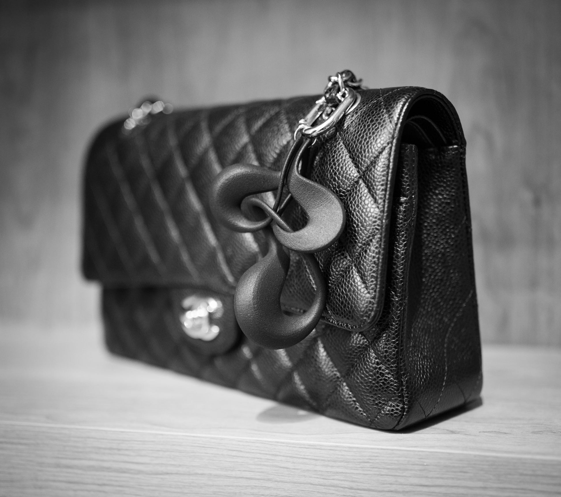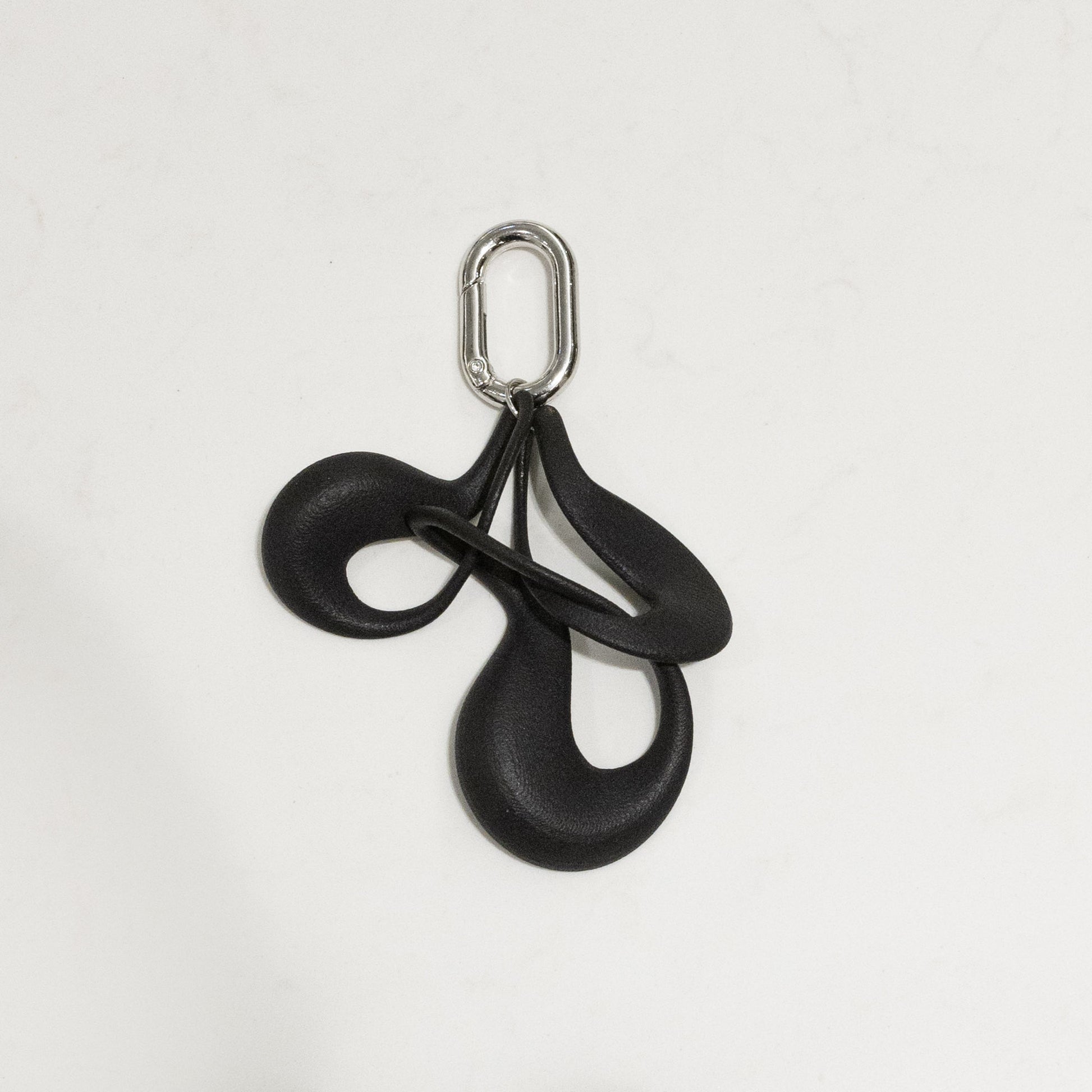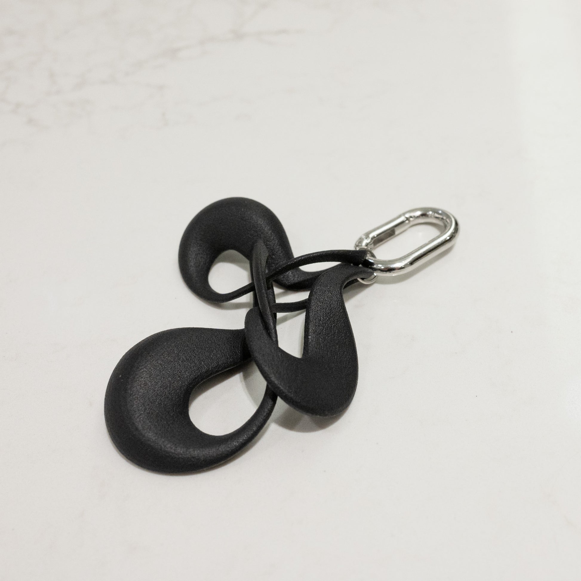 Crafted through SLS 3D printing in nylon PA12, Cluster Form I embodies the precision of digital fabrication and the warmth of hand finishing. The matte black surface absorbs light to emphasize shadow and depth, while the silver capsule clasp anchors the form. Designed as a sculptural bag charm, it transforms a cluster of loops into an object of calm density and tactile curiosity.