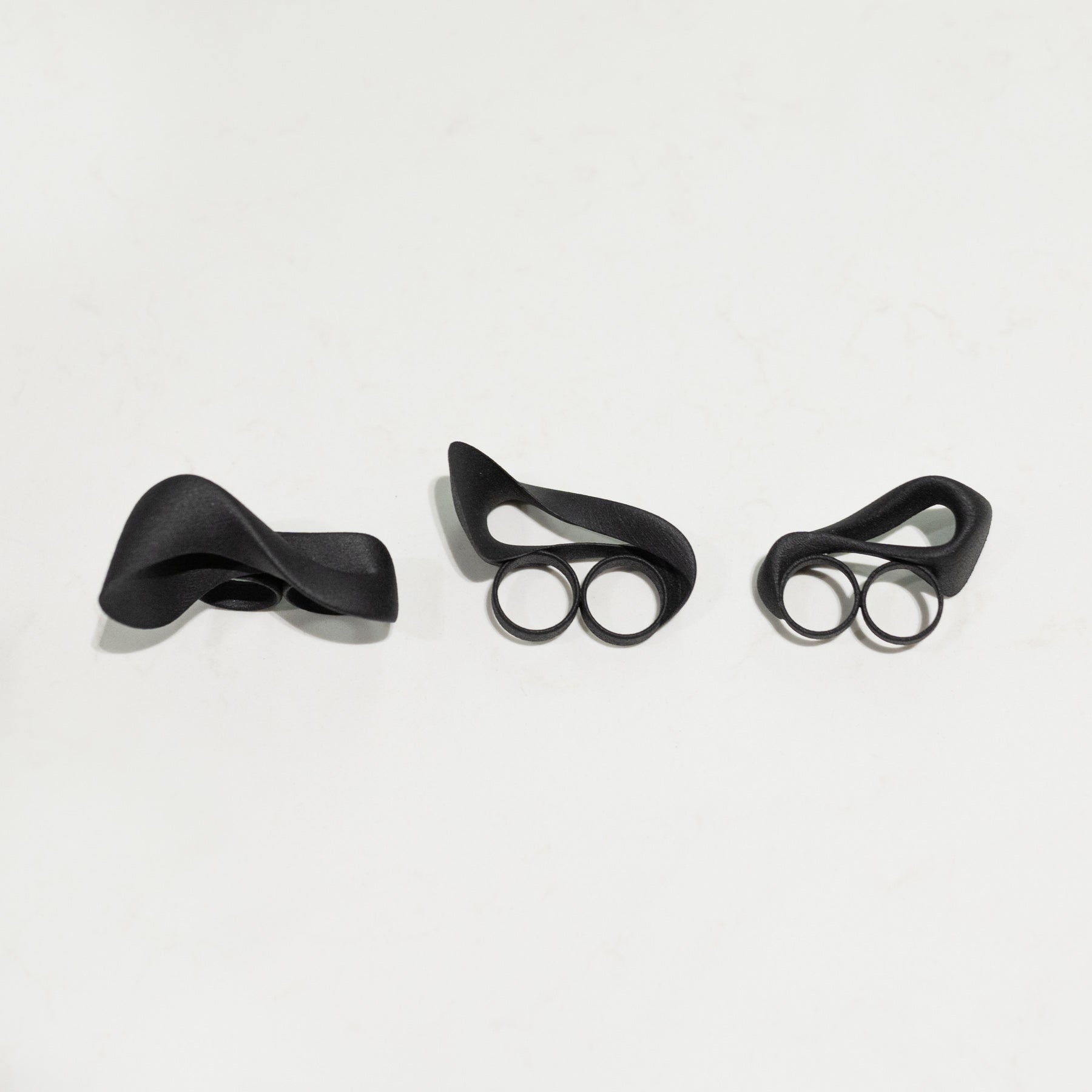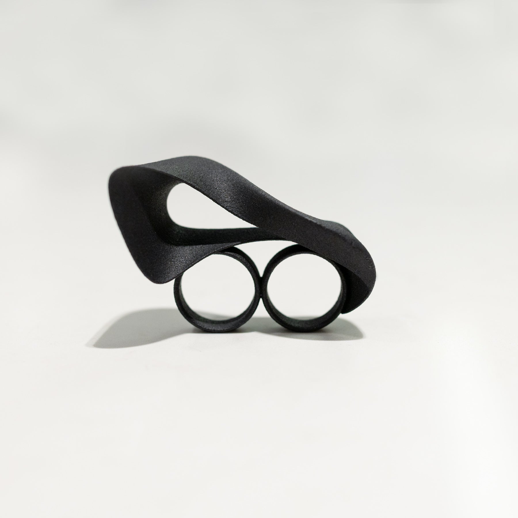 Produced with Selective Laser Sintering (SLS) nylon, Zaha achieves its twisting form with precision and clarity. The material is lightweight yet durable, allowing its ambitious geometry to be comfortably worn. SLS is also an innovative, lower-waste process, recycling unfused powder while enabling designs impossible with traditional methods. The result is a piece that unites daring form with sustainable innovation.